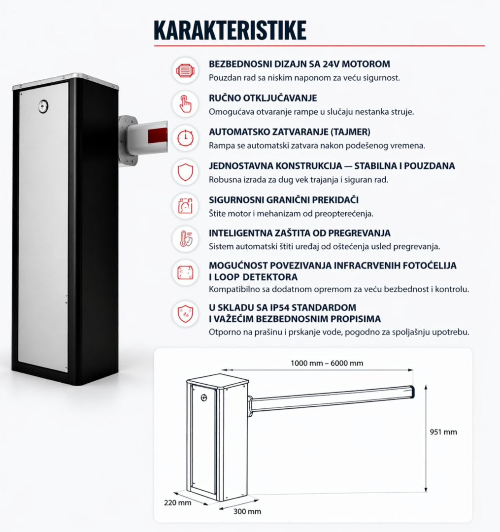 Automatska parking rampa sa 24V motorom predstavlja pouzdano i bezbedno rešenje za kontrolu pristupa na privatnim i javnim parking prostorima. Zahvaljujući modernom dizajnu i robusnoj konstrukciji, obezbeđuje dug vek trajanja i stabilan rad u svim uslovima.